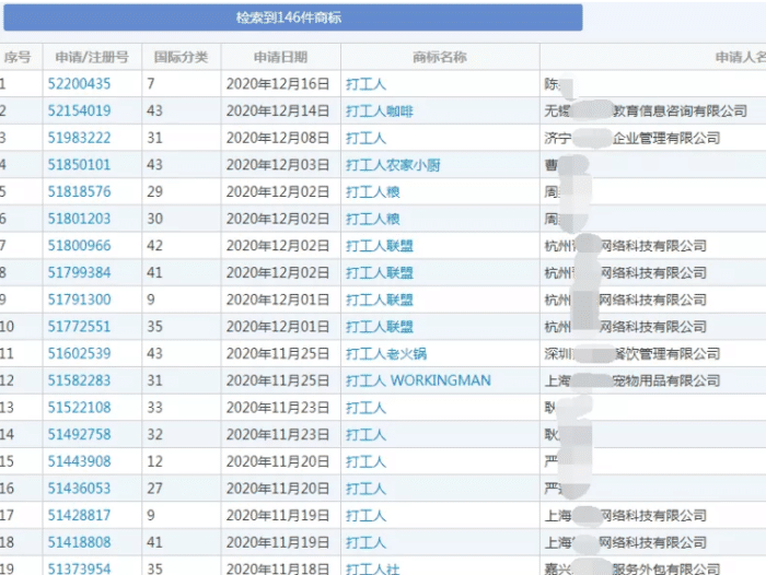 截至目前,总共有146件与“打工人”相关的商标注册申请。