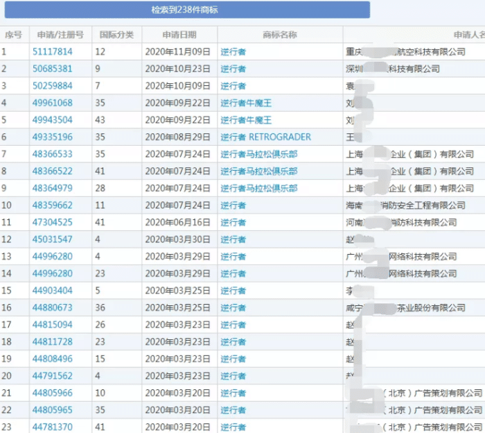 “逆行者”商标注册信息还挺不少的呢,截至目前共有238件。