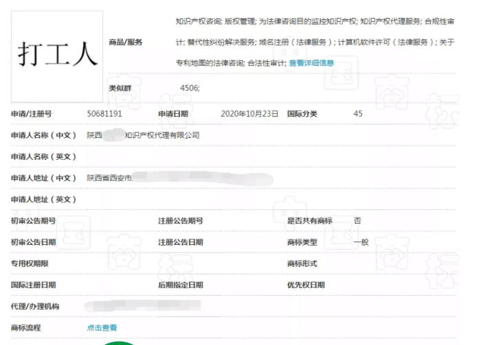 由于“打工人”的梗是在2020年开始流行起来的,因此今年最早申请注册相关“打工人”商标的是位于陕西的一家知识产权代理机构,申请时间为2020年10月23日,国际分类为第45类社会服务,目前该商标正处于待实质审查的状态中。
