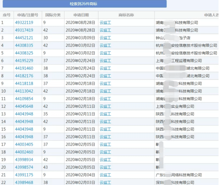 目前只有26件“云监工”商标注册信息,且均处于待实质审查状态。