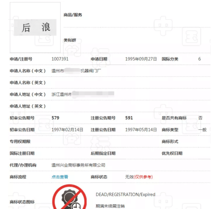 据商标网查询,早在1995年9月27日,温州市一机器阀门厂就申请了第6类“后浪”商标,不过该商标已经因为期满未续展而注销了。截至目前,有426件与“后浪”相关的申请商标。
