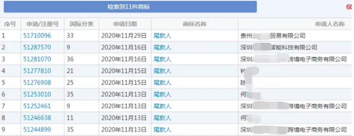 截至目前共有11件“尾款人”商标注册信息,由于是一个月前才申请的,因此还处于待实质审查状态。
