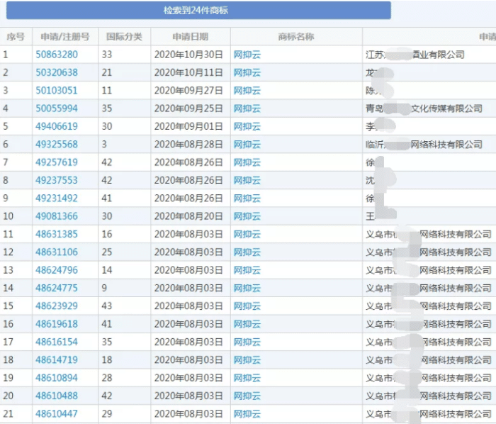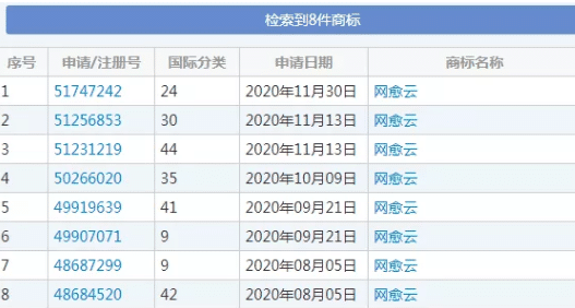 犹记得网易云音乐关联公司杭州网易云音乐科技有限公司在今年9月申请了2项“网愈云”商标,国际分类分别是“41类教育娱乐”和“9类科学仪器”,与其他申请人的商标注册状态一样,均为“注册申请中”。