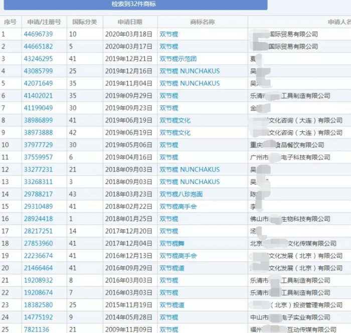 目前有总共32件“双节棍”商标注册记录,虽说这个热词是今年才火起来的,但它却已经在2004年作为商标被人注册了。只是过去这么长时间,最早注册的“双节棍”已处于无效状态,这或许是申请人没有及时办理商标续展的缘故。
