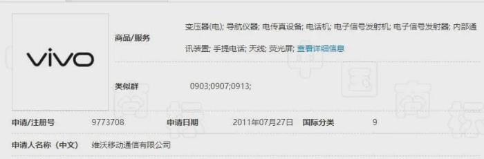 2012年9月21日,维沃公司注册了第9773708号商标,核定使用商品为第9类中的变压器(电)、导航仪器、电传真设备、电话机、电子信号发射机、电子信号发射器、内部通讯装置、手提电话、天线、荧光屏,有效期至2022年9月20日,该商标曾被认定为驰名商标。