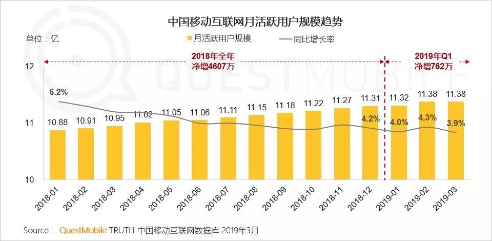 私域流量的大火,原因只有一个:流量红利消失,逐年增高的流量成本成为蚕食鲸吞企业利润的无底洞。根据QuestMobile发布的报告,2019Q1中国移动互联网月活用户增长进入“3%”时代。美团创始人王兴说互联网上半场的核心是人口红利,用户数量的飙升造就了互联网奇迹。但下半场,精耕细作的效率提升将会是唯一的出路。